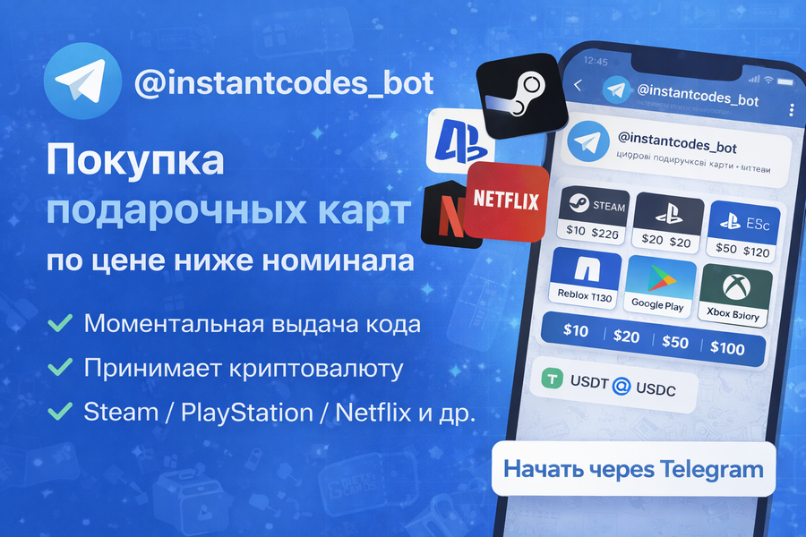 Telegram бот с подарочными картами со скидкой для покупки подарочных карт Steam США. Главная особенность — код приходит сразу после оплаты, цены стабильно ниже обычных. Экспериментировал пару раз, убедился в надёжности и скорости процесса.